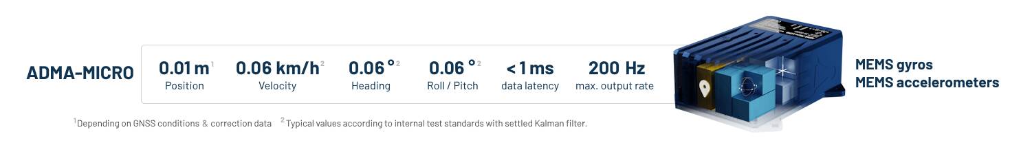 Die ADMA-Micro misst die 3D-Position in Echtzeit mit einer Genauigkeit von 0,01 m (1σ). Anhand der ebenfalls gemessenen Beschleunigungen und Drehraten lassen sich Geschwindigkeiten, Positionswinkel und Kurs bestimmen. Durch den Einsatz von MEMS-Kreiseln und -Beschleunigungssensoren ist es möglich, ein hochgenaues, kompaktes und leichtes Gerät zu bauen.