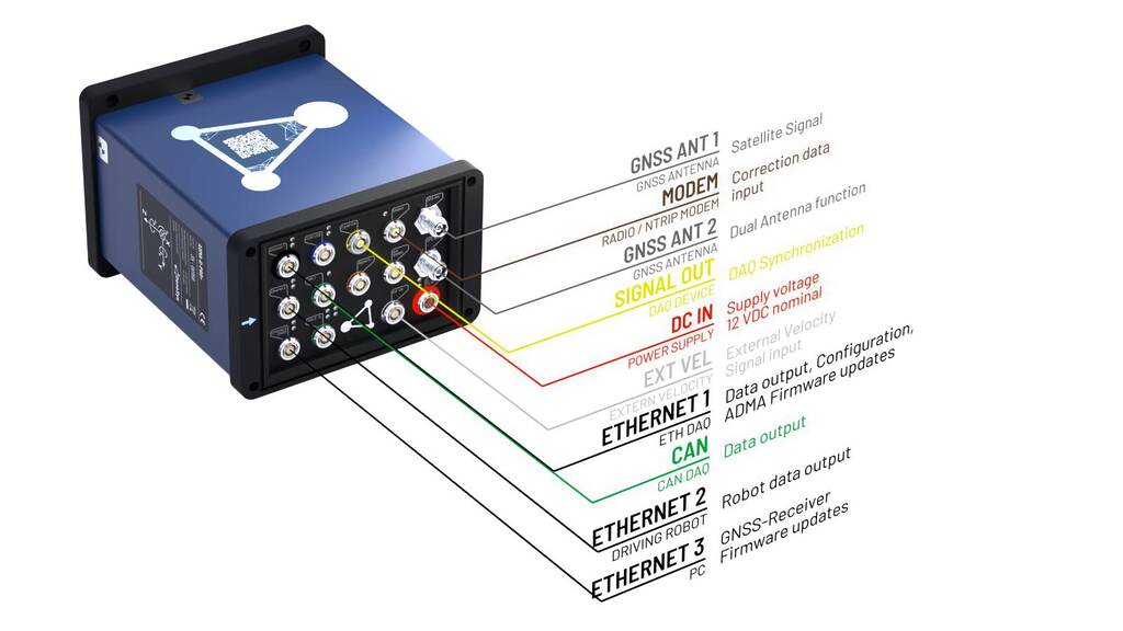 Ethernet 1 | Interface for ADMA data output, configuration and firmware update, steering and driving robot data output, optional for relative data calculation (e.g. range) and DGNSS routing, input/output. |