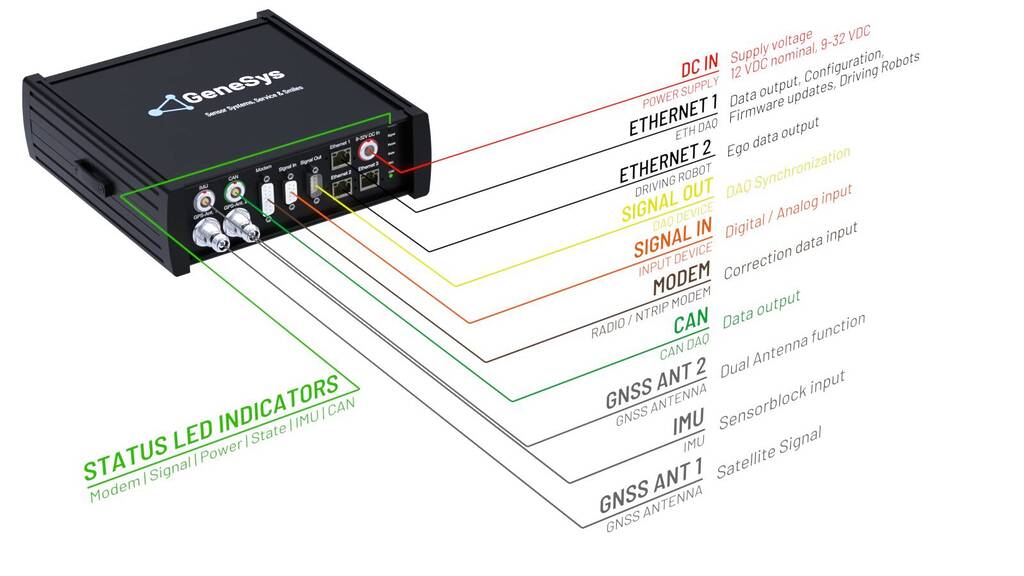 Ethernet 1 | Interface for ADMA data output, configuration and firmware update, steering and driving robot data output, optional for relative data calculation (e.g. range) and DGNSS routing, input/output. |