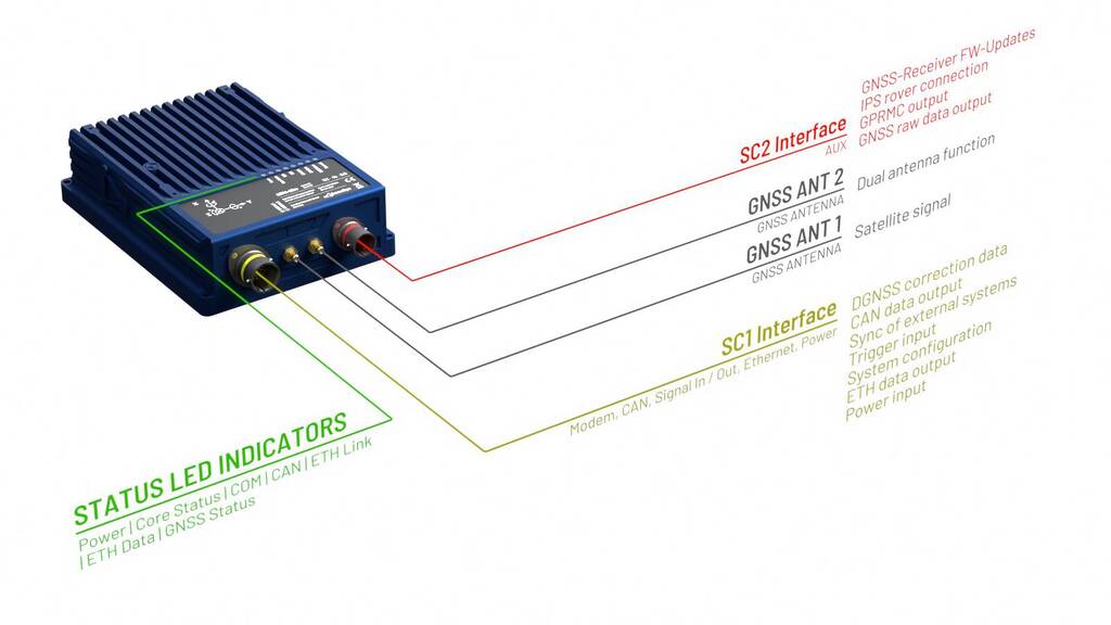 | SC1 Interface | Modem: • Correction data input • GNSS Receiver firmware updates • GNSS Raw data logging • GPRMC data logging CAN: • CAN 2b, 1Mbit for data output. Signal Out: • Sync out to assist synchronization • Frequency out to assist synchronization • Status information • GNSS PPS • Pulses for distance travelled Signal In: • Time measurement input for offline synchronization • Trigger input e.g. for light barrier or brake trigger • Analog signal measurement Ethernet: • Data output, configuration • firmware update • steering and driving robot data output • optional for relative data calculation (e.g. range) • DGNSS routing, input/output Power: • 12 VDC nominal supply voltage (input voltage range 9 – 32 VDC) |