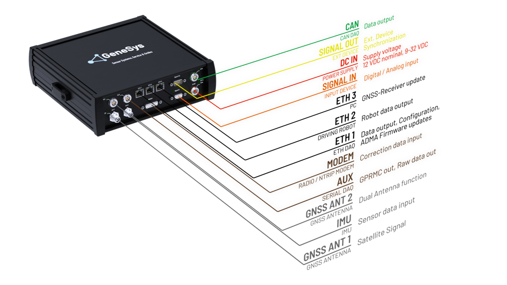 | Ethernet 1 | Interface for ADMA data output, configuration and firmware update, steering and driving robot data output, optional for relative data calculation (e.g. range) and DGNSS routing, input/output. |