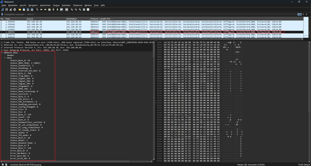 With the LUA scripts installed, Wireshark automatically detects and decodes the supported ADMA data streams.